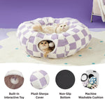 2-in-1 Cat Tunnel Bed Purple Daisy 80cm - Plush Donut Pet Cave & Play Tube - Detachable Washable Cushion & Interactive Hanging Toy for Indoor Cats