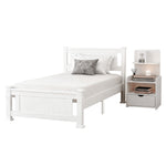 Rio Bed Frame: Crafted from natural pine wood, this bed frame is designed to provide durability and comfort for both kids and adults. The robust solid timber slated base ensures strong support, while the stylish headboard and heavy-duty steel fixings add an elegant touch. Finished in a non-toxic, eco-friendly white paint, the neutral color allows for seamless décor coordination in any bedroom. Choose the Rio bed frame for a contemporary, quality sleep solution that stands the test of time.