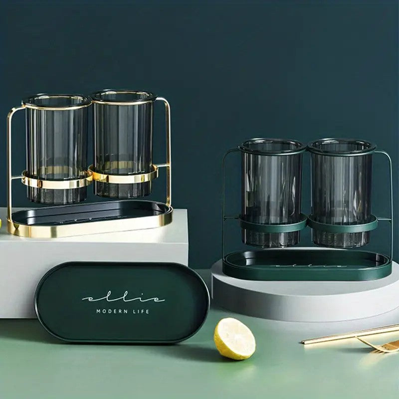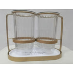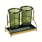 This luxury ironware chopstick holder set masterfully blends practicality and aesthetics with its minimalist yet refined design. The translucent, faceted glass cylinder, adorned with vertical stripes, allows a clear view of the internal golden utensils and wooden chopsticks, making them easy to accesstruly realizing the concept of "visible elegance, no need to hide." The entire piece features a sturdy golden metal frame and base, complemented by a stainless steel drip tray at the bottom to keep the surface dry and clean.
