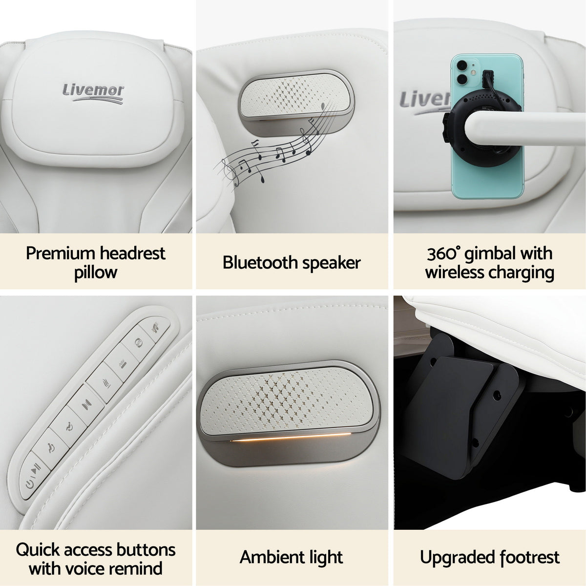 Experience the ultimate in home relaxation with our Livemor AI-integrated massage chair, specifically engineered to melt away stress and tension. Featuring an innovative expandable 155° floating rail, it provides a weightless sensation that perfectly aligns your body for maximum relief. Target your core discomfort with specialized lower back and hip heating at a soothing 52°C, complemented by a sophisticated 4-airbag hip compression system and bionic vibration technology for the hips and legs. This chair is designed for the modern lifestyle, boasting a 360° smooth-adjusting gimbal support with integrated wireless phone charging, allowing you to stay powered up while you unwind. Navigating your comfort is effortless thanks to 4 automatic massage programs, quick-access buttons, and intuitive voice reminders. To complete your sensory experience, the chair features built-in Bluetooth speakers for your favorite audio and integrated ambient lighting to create a serene spa atmosphere in any room. Whether you are recovering from a long day at work or a strenuous workout, this all-in-one wellness solution offers the perfect blend of luxury, technology, and relaxation.