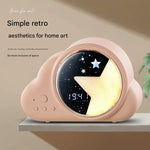 Enhance your living space with our 3-in-1 Retro Cloud Alarm Clock, a charming device that combines a digital clock, a bedside night light, and a wireless Bluetooth speaker. Its simple retro aesthetic and soothing, harmonious appearance make it a beautiful addition to any room, designed for home art. This smart device features a night light function with a delightful starry sky and moon/star design, USB charging mode, and a digital clock that can sync with your mobile phone. Enjoy HIFI-level audio quality via Bluetooth 5.3 connectivity for seamless music streaming from up to 10 meters away, with multiple playback modes available. Powered by a 1500mAh lithium battery, it's a versatile and stylish companion for your home.