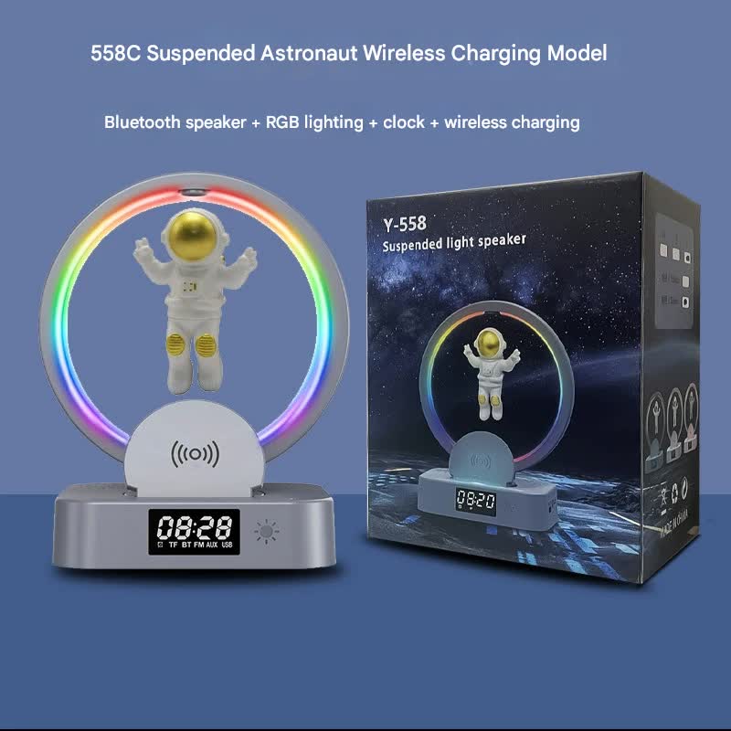 Elevate your audio-visual experience with this multifunctional Astronaut Levitating Bluetooth Speaker Lamp. This creatively designed device seamlessly integrates a Bluetooth speaker, an RGB LED ambient light, a wireless phone charger/stand, a digital clock, and multiple audio input options into one stunning unit. Featuring a captivating levitating astronaut figurine within a vibrant RGB light ring, it offers 7 different light modes to suit any mood or scene. Enjoy seamless music streaming via Bluetooth 5.0 with a range of 7-10 meters, or utilize its FM radio, TF card slot, USB port, or AUX input for versatile playback. The central control panel allows for easy touch control of volume, light effects, and power. With a built-in 1200mAh/1500mAh battery and 5W power output, this device is a true audio-visual feast and a perfect centerpiece for any modern living space.