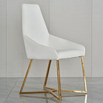 Enhance your dining experience with this elegant and contemporary set of four (4) dining chairs. Each chair boasts durable, easy-to-clean white PVC upholstery, offering a fresh and bright look. The standout feature is the unique gold finish on the sturdy metal criss-cross legs, providing exceptional stability and a touch of sophisticated glamour.