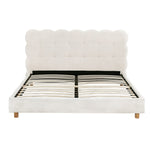 Artiss cloud headboard bed frame in white. Features boucle fabric upholstery and durable wood and metal construction. This platform base fits queen mattresses. Includes wooden slats and metal legs for strength. Easy to assemble. Supports up to 300KG. Note: Actual colour may vary.