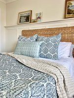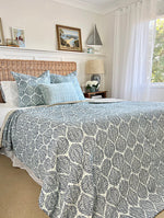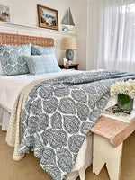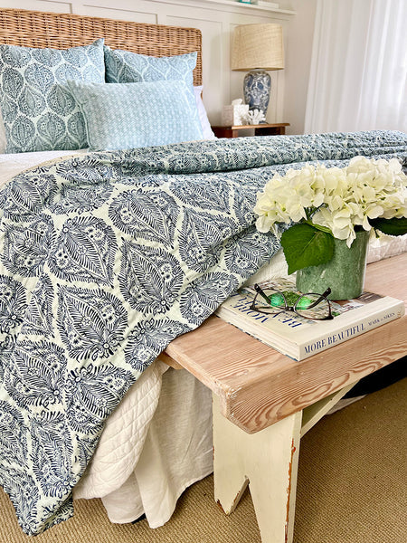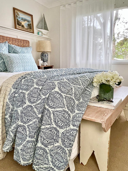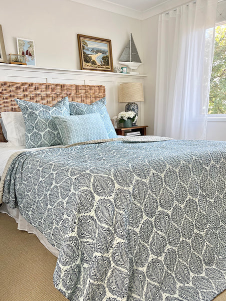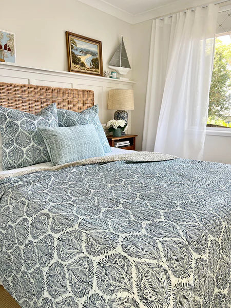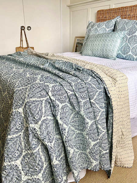 Handmade by skilled Indian artisans, this beautiful bedspread features a delicate blue pattern on a soft pale blue and white background. Each piece is finished with the traditional kantha stitch — a heritage embroidery technique passed down from mother to daughter — giving it a uniquely textured and authentic feel.