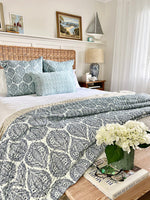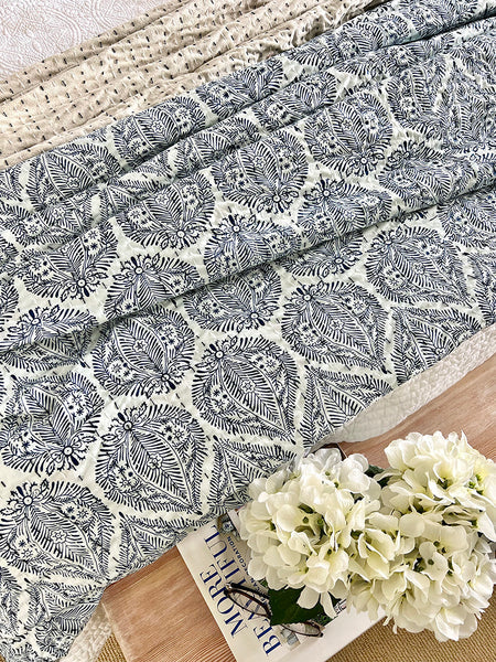 Inspired by the intricate carvings of Jaipur’s royal palaces, the Blue & White Jaipur Palace Kantha Coverlet brings a touch of regal artistry and calm sophistication to your bedroom.