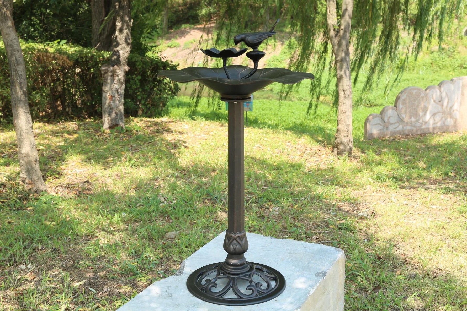 Design: Combines artistic floral detailing with a functional water basin for birds