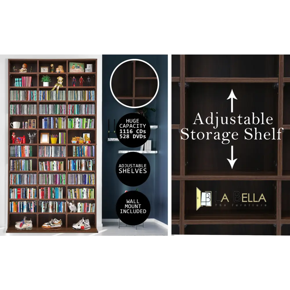 One of the standout features of this Bella storage shelf is its adjustable shelving system. This adaptability allows you to customize the configuration to suit your specific requirements. Whether you're storing standard-sized CDs or larger Blu-ray cases, you can easily modify the shelf heights to accommodate your collection. Furthermore, this versatility extends beyond media storage, enabling you to showcase books, magazines, photo frames, and cherished memorabilia, creating a personalized display that reflects your unique taste.