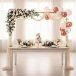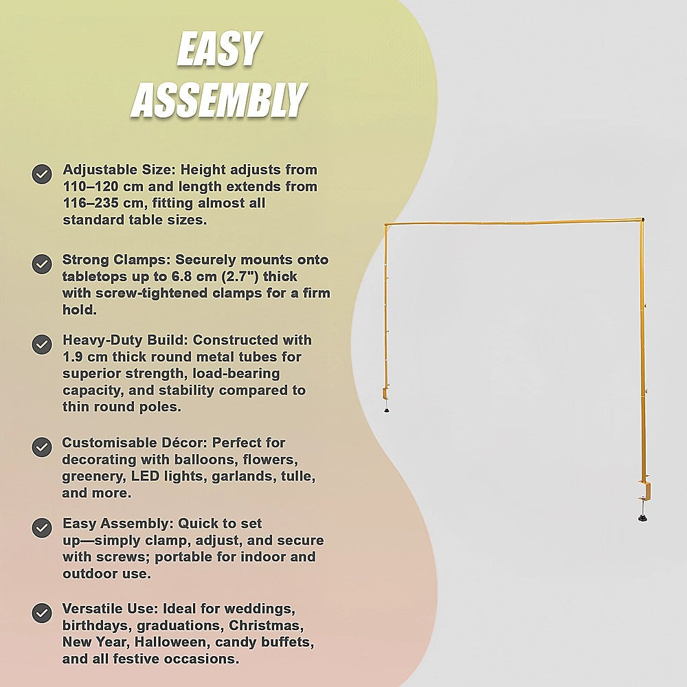 Transform any occasion into a breathtaking celebration with this adjustable over-the-table arch stand with clamps. Designed to fit most tables, this sturdy and versatile stand makes it easy to hang balloons, flowers, greenery, lights, or garlands to create unforgettable backdrops. Perfect for weddings, birthdays, holiday events, and parties, it's built with durable square metal tubing for extra stability and effortless style.